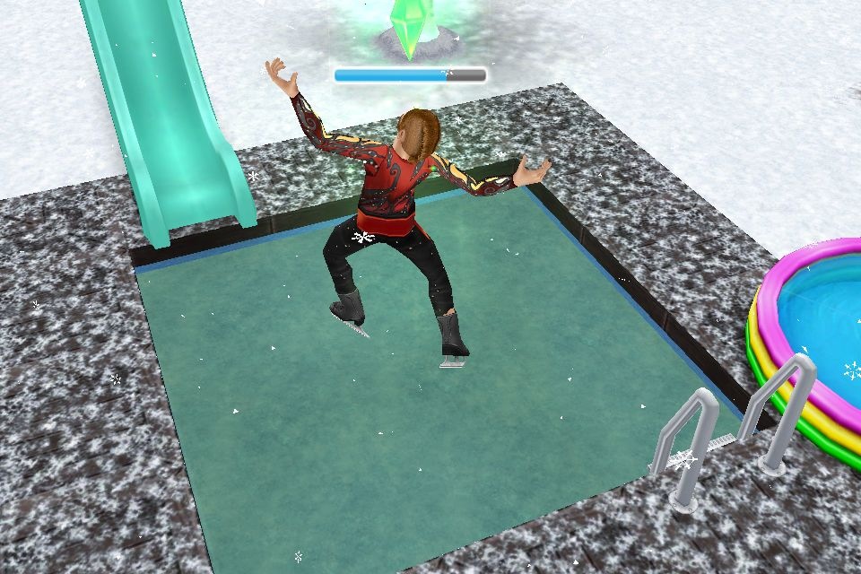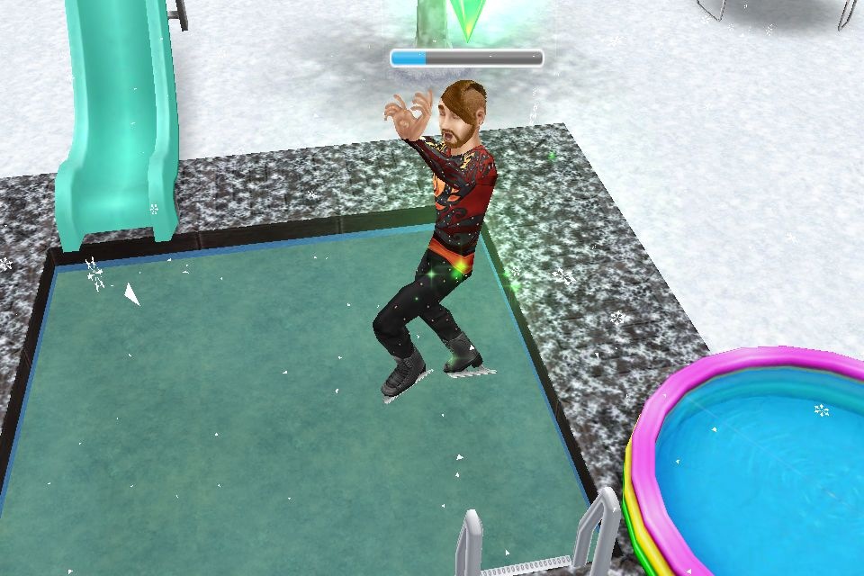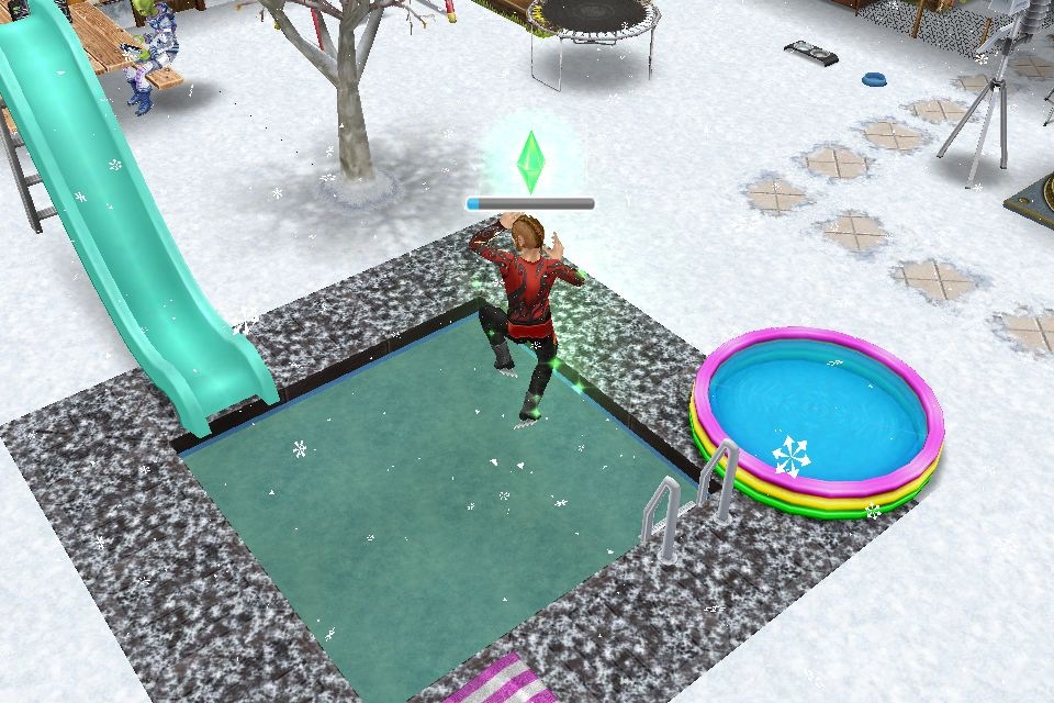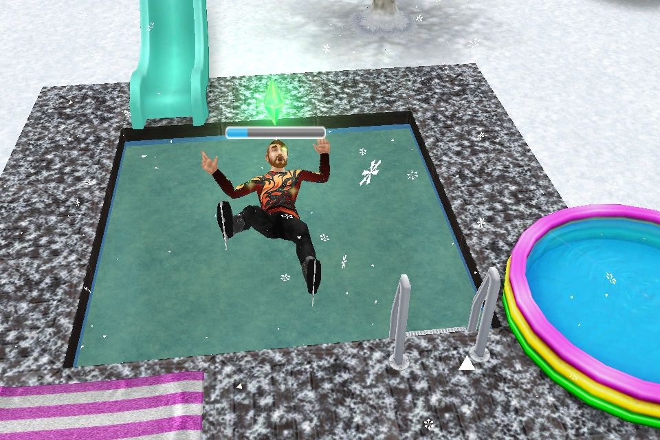 そういえば、先日のシムズフリープレイのアップデートで、雪が降ると同時にプールが氷になるという環境の変化がありました。