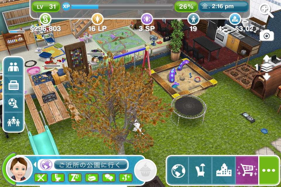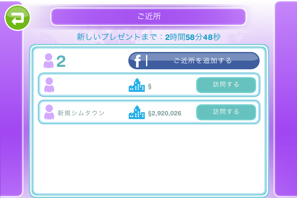 このシム操作の(何だったっけ)がたくさん表示されている、それが今回のアップデートのポイントです。Facebookのシムズフリープレイをしている友達のタウンに、遊びに行けるようになったんですね。